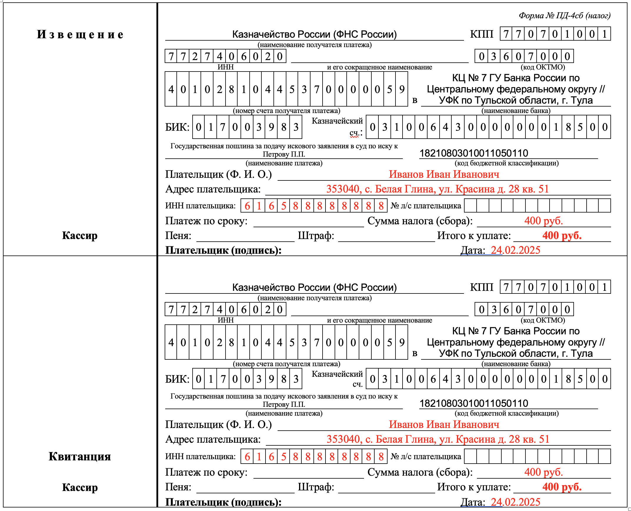 Квинтанция и реквизиты для оплаты Государственной пошлины